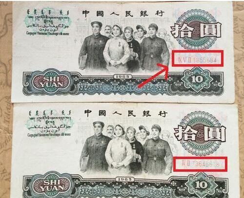 各位读者请看上图小编用颜色框起来的冠字号,二罗马八数字,这类的大团结10元一般属于一类版本,这种类型相比发行量比较大,这类的大团价一张100-300元不等,前提是面相好。