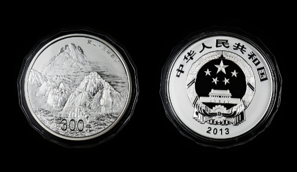 为纪念黄山大观,倡导人们共同保护珍贵的自然遗产,中国人民银行于2013年8月8日发行了世界遗产——黄山金银纪念币一套。该套纪念币共8枚,其中金币3枚,银币5枚,均为中华人民共和国法定货币。在这套币中有一枚纪念银币格外引人注目,重达1公斤,其正面图案为中华人民共和国国徽,并刊国名、年号,背面图案为“玉屏胜景”景观等组合设计,并刊“黄山·玉屏胜景”字样及面额。