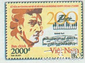 除了彼兰邮政之外,越南邮政也在2 月发行了肖邦诞生200 周年邮票(图3 ) ,图案为肖邦的侧面像以及第一钢琴协奏曲的乐谱。在肖邦所有的作品中,第一钢琴协奏曲绝对是一首动人的诗,特别是它的第一乐章,使音乐爱好者魂牵梦萦,许多人迷恋肖邦就是从这首协奏曲开始的。