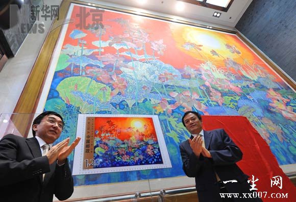 5月25日,著名画家黄永玉在欣赏根据他的画作《荷》设计的邮票。当日,中国邮政发行“第十届世界旅游旅行”纪念邮票一套一枚。邮票图案是著名画家黄永玉为北京荣宝斋大厦捐献的巨作《荷》。